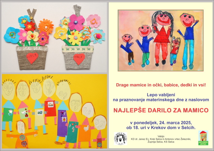 Jubilejno 30. šolsko leto je polno prijetnih dogodkov. Naš slogan je V majhni hiši je veliko prijateljev in tokrat smo prijateljstvo navezali širše, izven našega vrtca. Starši nam zaupajo v vzgojo in varstvo svoje otroke ne samo z ožjega območja Železnikov, pač pa iz cele Selške doline: od Svetega Lenarta pa vse do Davče. Ker je bilo do sedaj skoraj 20% otrok iz območja Selc, smo predlagali, če bi bila letos prireditev za materinski dan skupni projekt Antonovega vrtca in KUD dr. Janez Ev. Krek. In je bila.