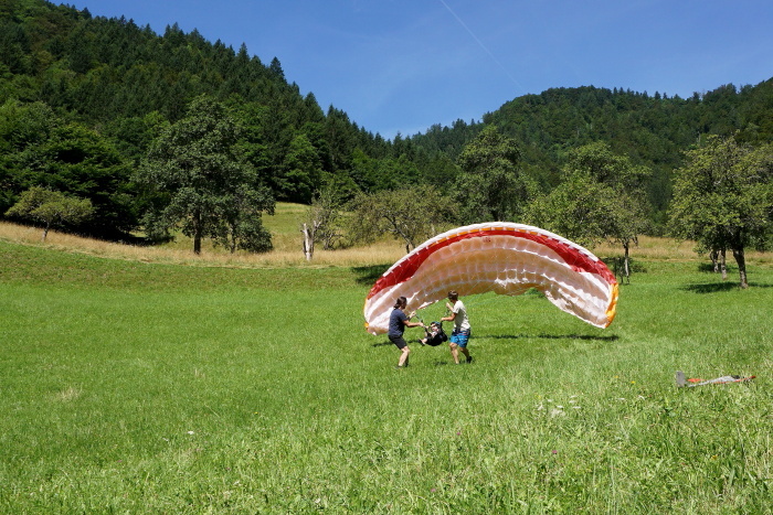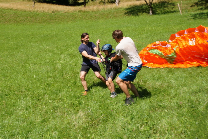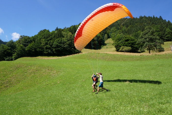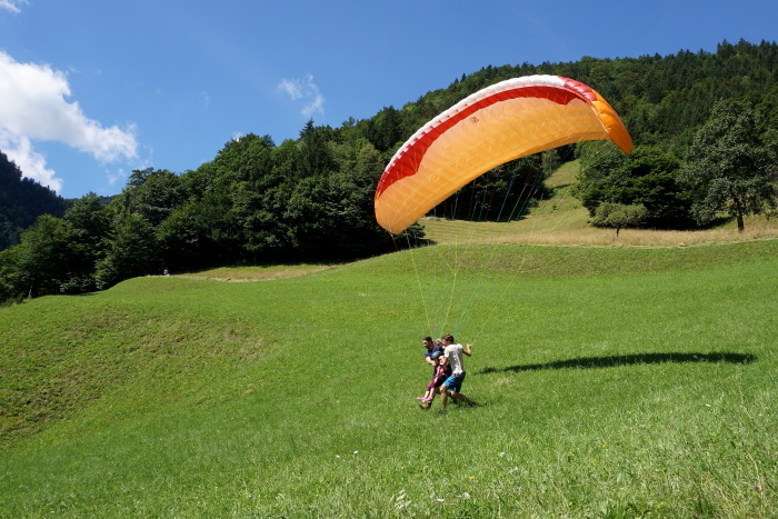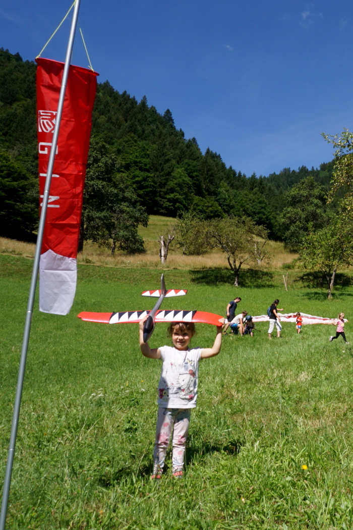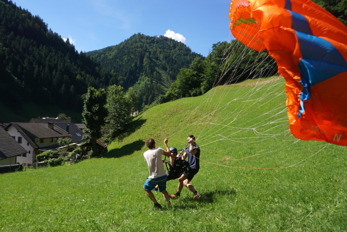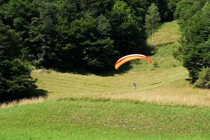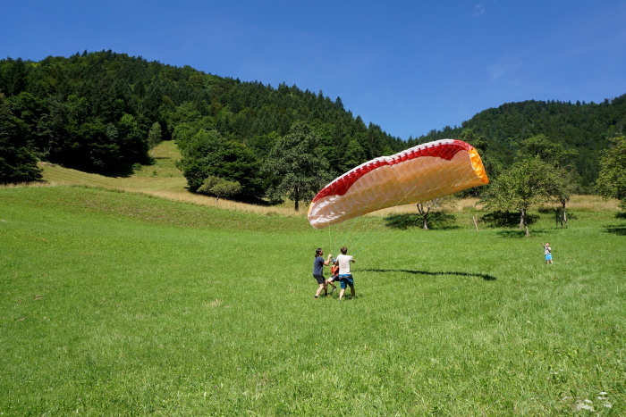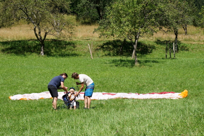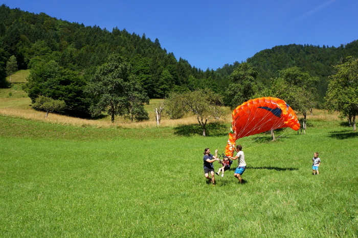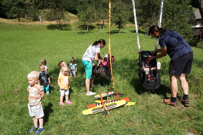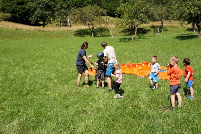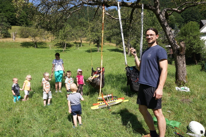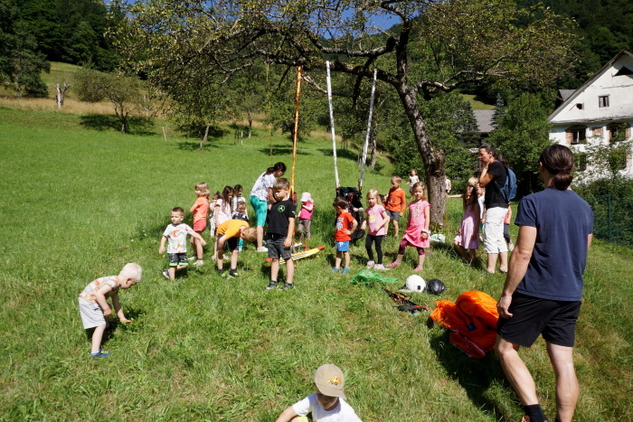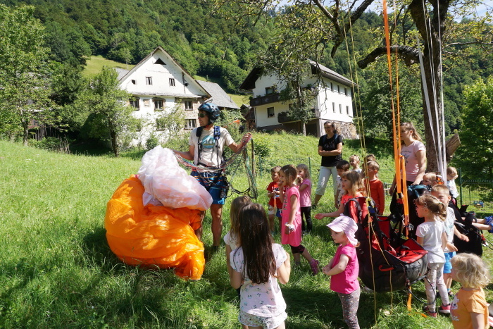 Na vroč poletni dan sta nas v vrtcu obiskala Gašper Prevc in Miha Košmelj. Prišla sta s padalom. Da je bil prihod bolj atraktiven, je Gašper poletel z vrha hriba in pristal nekaj metrov stran. Pokazala sta nam pripomočke, ki jih potrebujeta za letenje – woki toki, čelada, padalo… Na bližnjem drevesu sta napravila tudi gugalnico. Najpogumnejši otroci so lahko tudi skočili s padalom, seveda s pomočjo dveh izkušenih mojstrov.